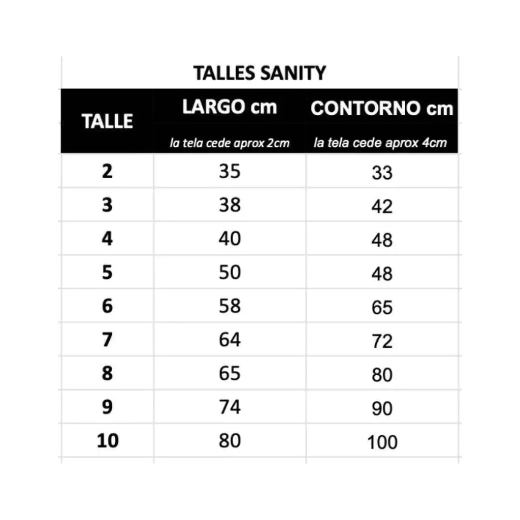 Talle 10: 80 cm de Largo, 100 cm de Contorno de Pecho