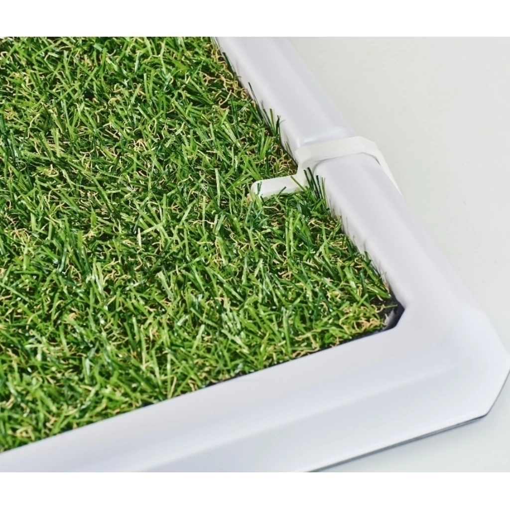 Única bandeja con clips traba pasto del mercado, asegurando que tu perro no saque el pasto de la respectiva bandeja.
