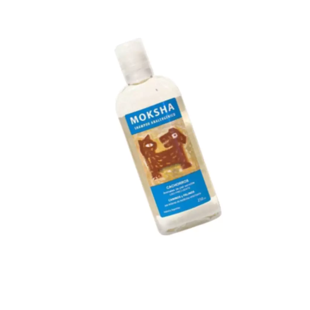 Shampoo Moksha Analergénico Cachorros y Animales de Piel Sensible Shampoo específicamente formulado con tensioactivos hipoalergénicos combinado con Acido Láctico de acción humectante, antiséptica, queratolítica, emoliente que restablece el equilibrio de la epidermis. El agregado de extrasol de manzanilla le confiere un poder suavizante y calmante, Indicado especialmente en cachorros caninos y felinos, en animales adultos de piel sensible y en los que por diversos motivos requieren un shampoo de uso frecuente.